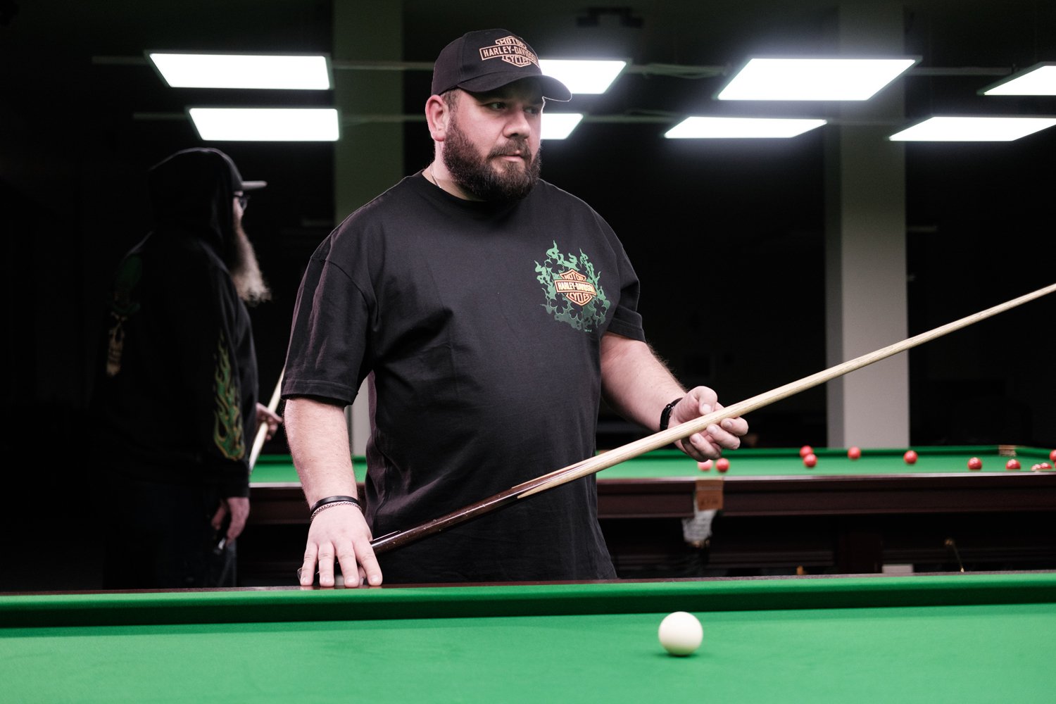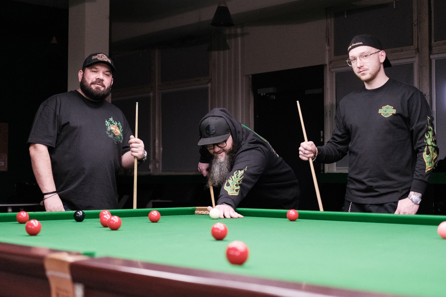 Uczestnicy grają w małych grupach przy stołach snookerowych i bilardowych.